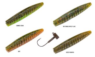 Vinilo tipo Stick Bait con forma de gusano de 65 milímetros de la marca Strike King modelo Ned Ocho en color verde con pintas rojas ideal para pesca al estilo Finesse.