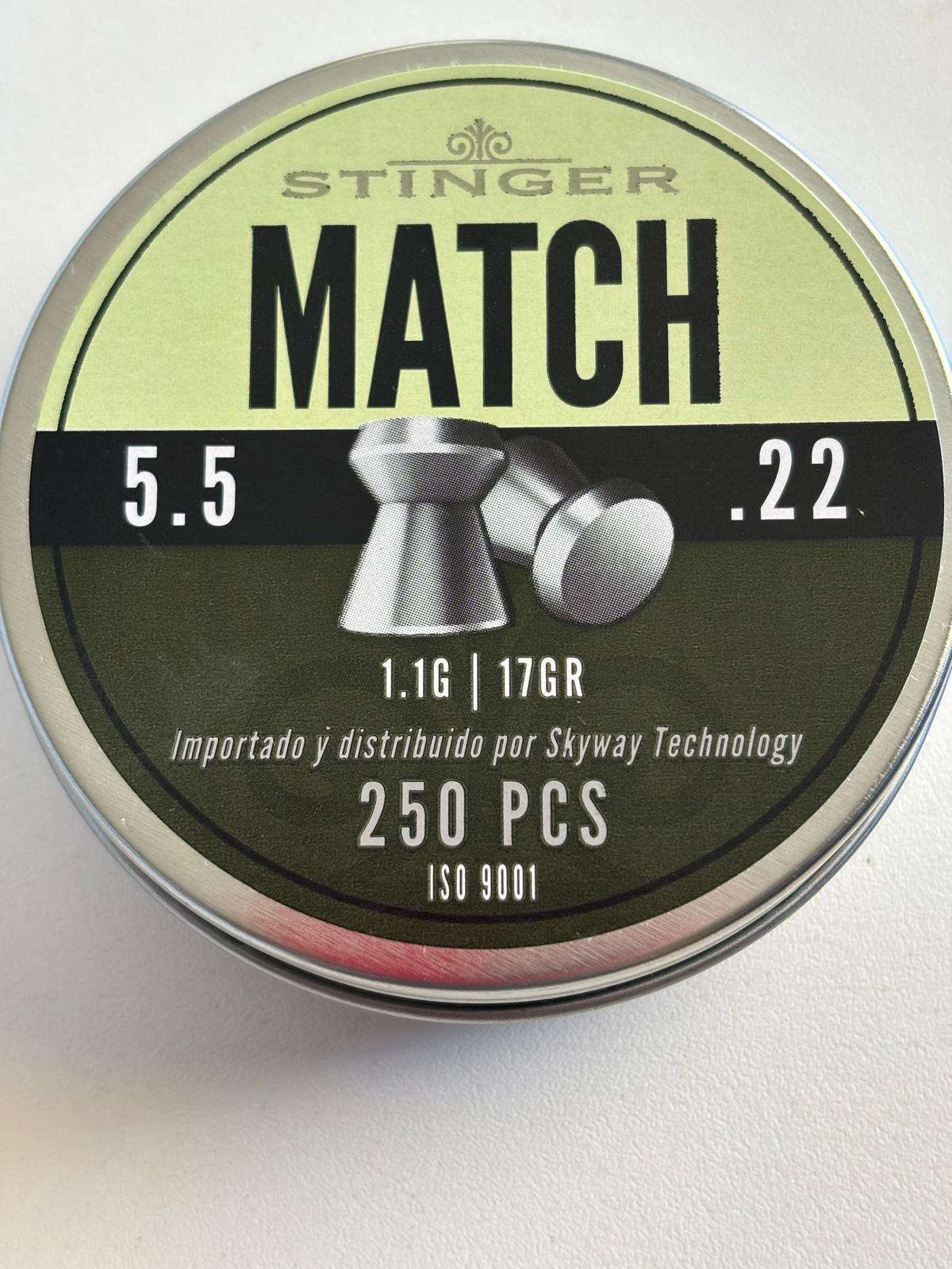Balines Stinger Match, con punta plana y calibre 5.5mm. Cada caja contiene 250 ud. Cada balín pesa 1.1 gr.