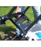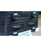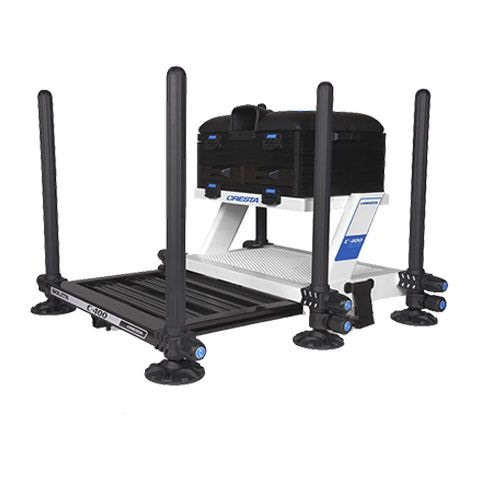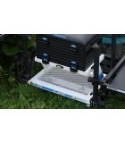 El C400 tiene un compartimento de almacenamiento debajo del asiento para arneses y flotadores. También hay un cajón lateral y dos cajones frontales con cerraduras magnéticas. La parte inferior del marco sobre el que descansa el compartimento está sellada con una placa de malla, lo que crea un espacio de almacenamiento adicional ventilado. El compartimento se fija al marco con cuatro clips y se puede quitar por completo si es necesario. La estructura de aluminio, robusta y ligera, está equipada con un reposapiés de ajuste continuo y, gracias a su diseño inteligente, se puede colocar muy cerca del suelo. Las patas de Ø 36 mm proporcionan suficiente estabilidad a cualquier altura. Cuatro de las seis patas son telescópicas y todas tienen una parte superior redondeada y patas de barro inclinables. Gracias al sistema antihuellas de 360º, las patas se pueden fijar a cualquier altura. La parte inferior debajo del marco está cerrada con una placa de malla, que deja espacio para cajas de cebo o cajas de longitud de anzuelo durante el transporte y la pesca. Gracias al cajón extraíble y a la placa de rejilla se crea un espacio de almacenamiento adicional y ventilado. La plataforma para los pies es continuamente extensible y se puede quitar por completo si se desea. Cuatro de las seis patas son telescópicas y todas tienen una parte superior redondeada y patas de barro inclinables.