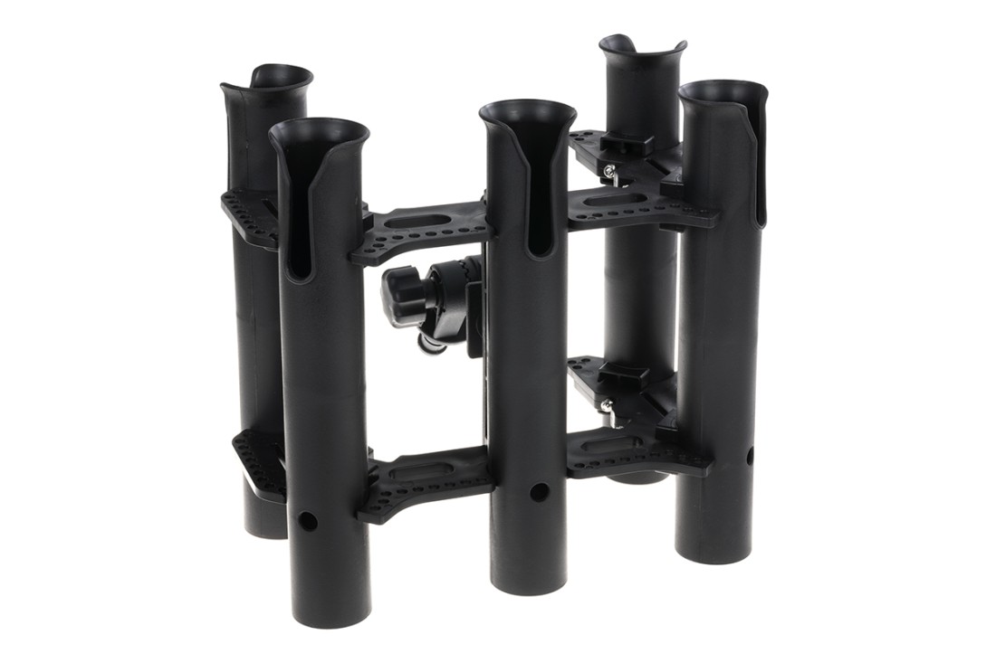 Capacidad de 5 Tubos: Cinco receptáculos individuales perfectamente espaciados para evitar que las manivelas de los carretes choquen entre sí.